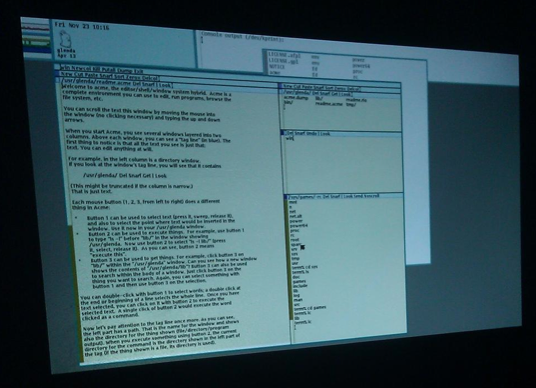 Now, if you’re like me, you’ll be sitting at a brand new and pretty much inscrutable desktop environment (called “Rio”, btw). In fact, here’s a short list of OSs that Plan 9 is not really like: