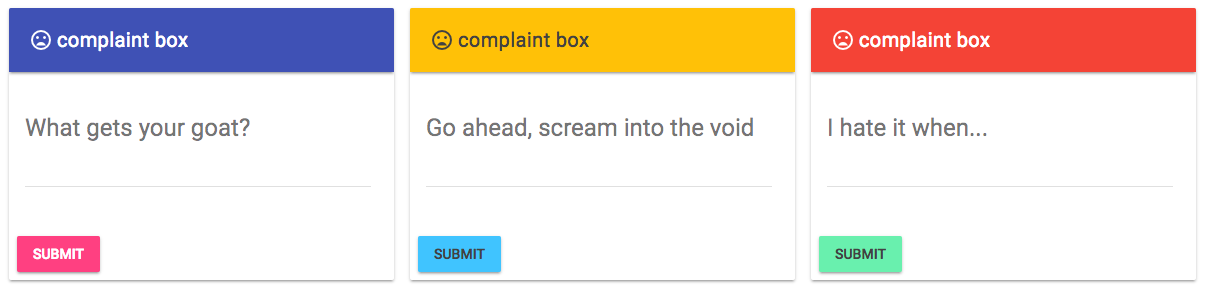 We're going to make a web component called "mini-form". (Custom element names have to start with a lowercase letter and have one or more hyphens. For more info, see the spec.) It will be a very simple form that invites users to submit a complaint and confirms receipt the user's input (with which it does nothing). The form will match the size of its containing element and the length of the question text. It has a basic material design style; you can assign the color theme for each instance. The code is at https://github.com/pearlbea/mini-form and a demo is here.