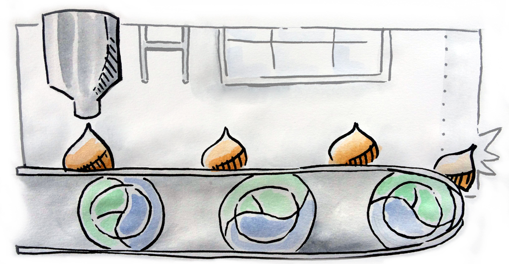 For a lazily-loaded collection, we can imagine that a tube comes down next to the worker’s station on the assembly line. The tube fills up with candies coming from somewhere else. Every time the worker takes one to process, there’s another candy waiting. Again, the input and output don’t matter. The worker just does their filtering job of removing the bad candies.