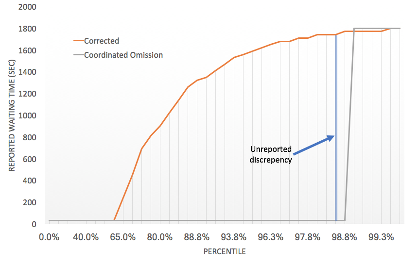 The corrected average is 4 minutes and 15 seconds well past the one minute time needed for the bonus. By not recording all customers coming to our shop Coordinated Omission gives us the false impression that we're serving customers almost 5 times faster then we actually are. Not only does Coordinated Omission wildly underestimate your response time it can show performance improvements as making things worse. Lets say instead of working furiously serving people in 30 seconds for the first 90 minutes you served everyone at a more sedate pace of 55 seconds. People would think that your performance was 5.5 seconds slower!